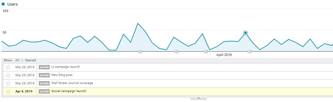 If your tagged links don’t get published, it doesn’t have to be the end of the road for attributing website visitors to PR efforts. Another way to proactively know is by keeping track of when coverage hits using annotations (notes to yourself or your team on the data).